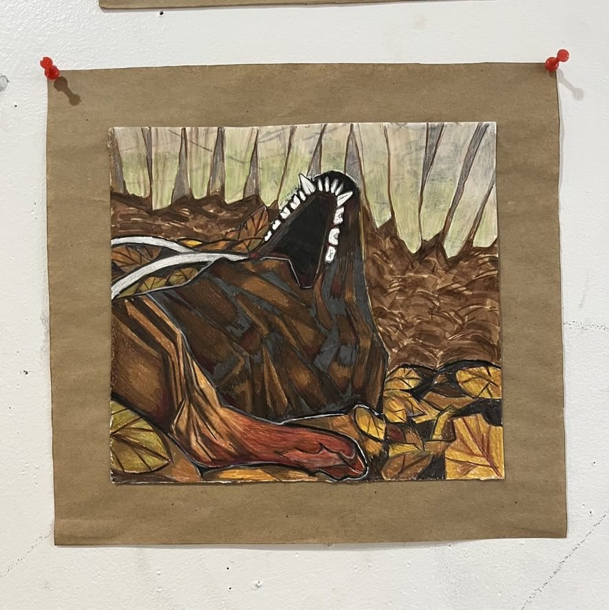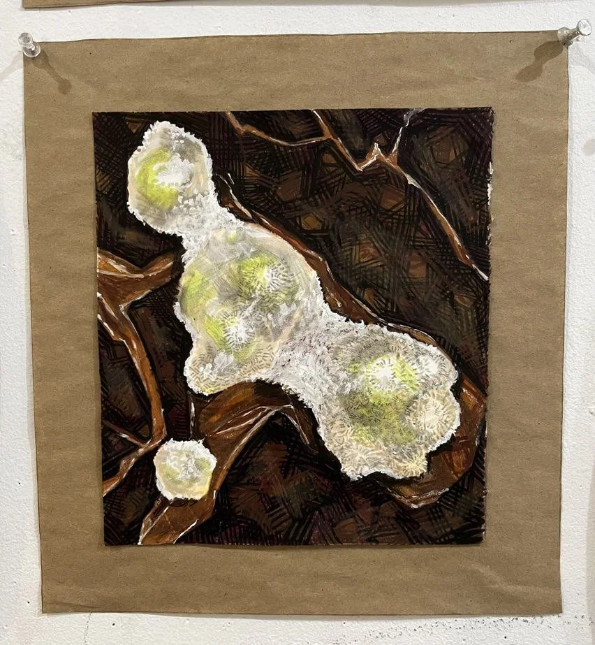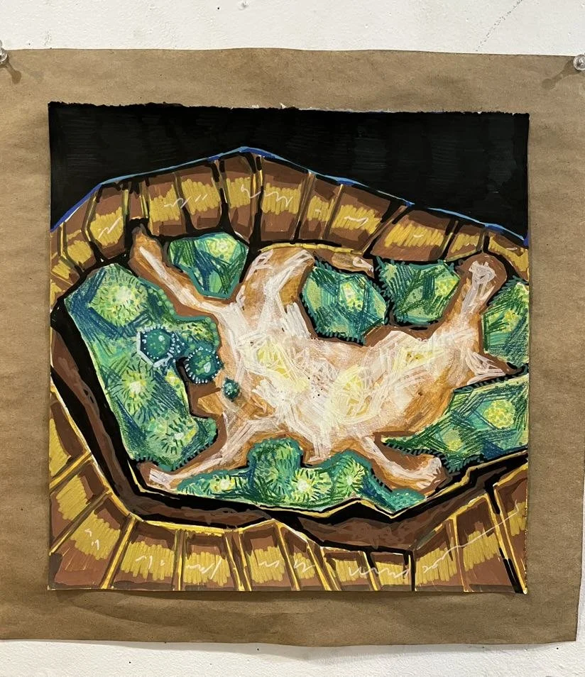Acrylic ink, oil pastel, & marker on cotton rag paper.