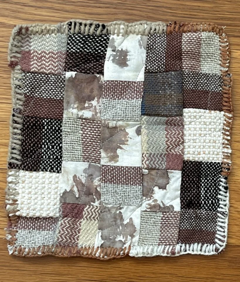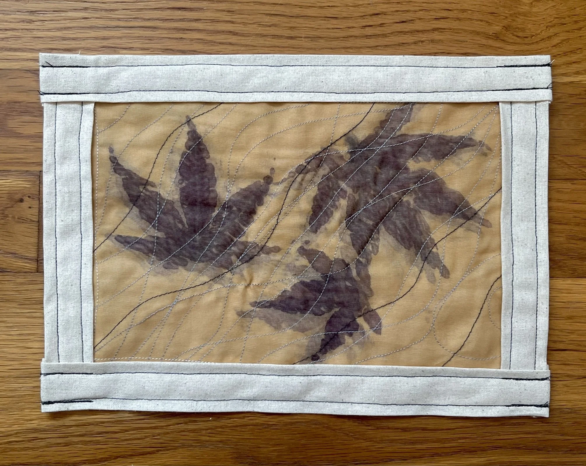 Japanese maple leaves pounded on iron-mordanted silk organza. Free-motion quilting, cotton batting and binding.