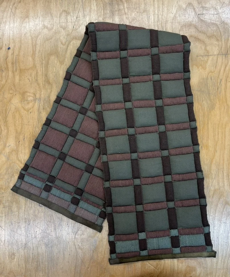 Handwoven cotton, linen, wool, silk, alpaca & iron dyed cotton. Cutch & madder dyed wool border.