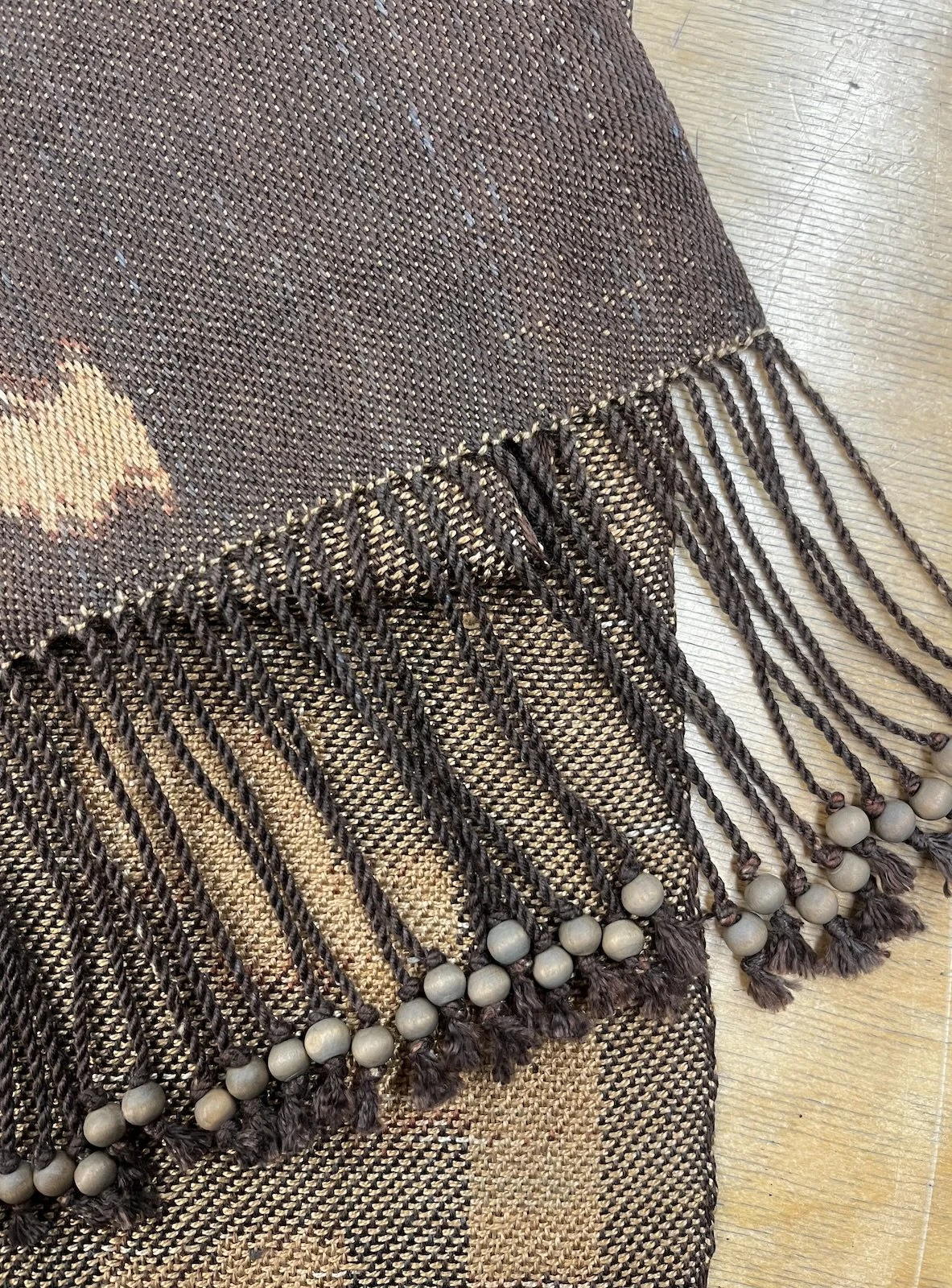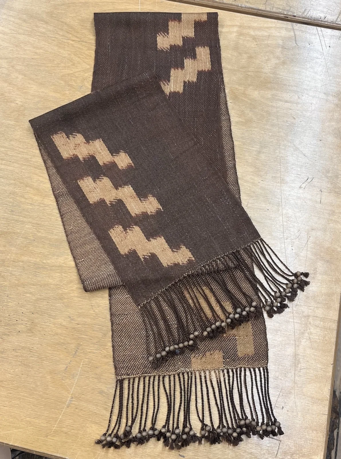 Ikat on silk. Cutch and indigo dyes. Wooden beads on fringe.